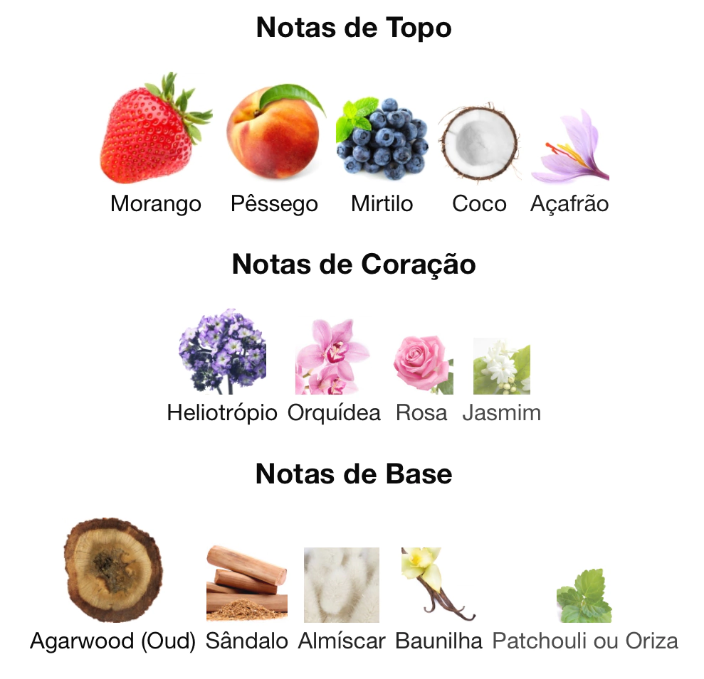 Notas de Saída : Morango, Pêssego, Coco, Açafrão