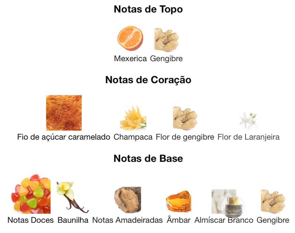 Gengibre fresco e tangerina, gengibre e flor de laranjeira, baunilha, açúcar caramelizado e gengibre cristalizado são combinados com notas amadeiradas, almíscar branco e âmbar.